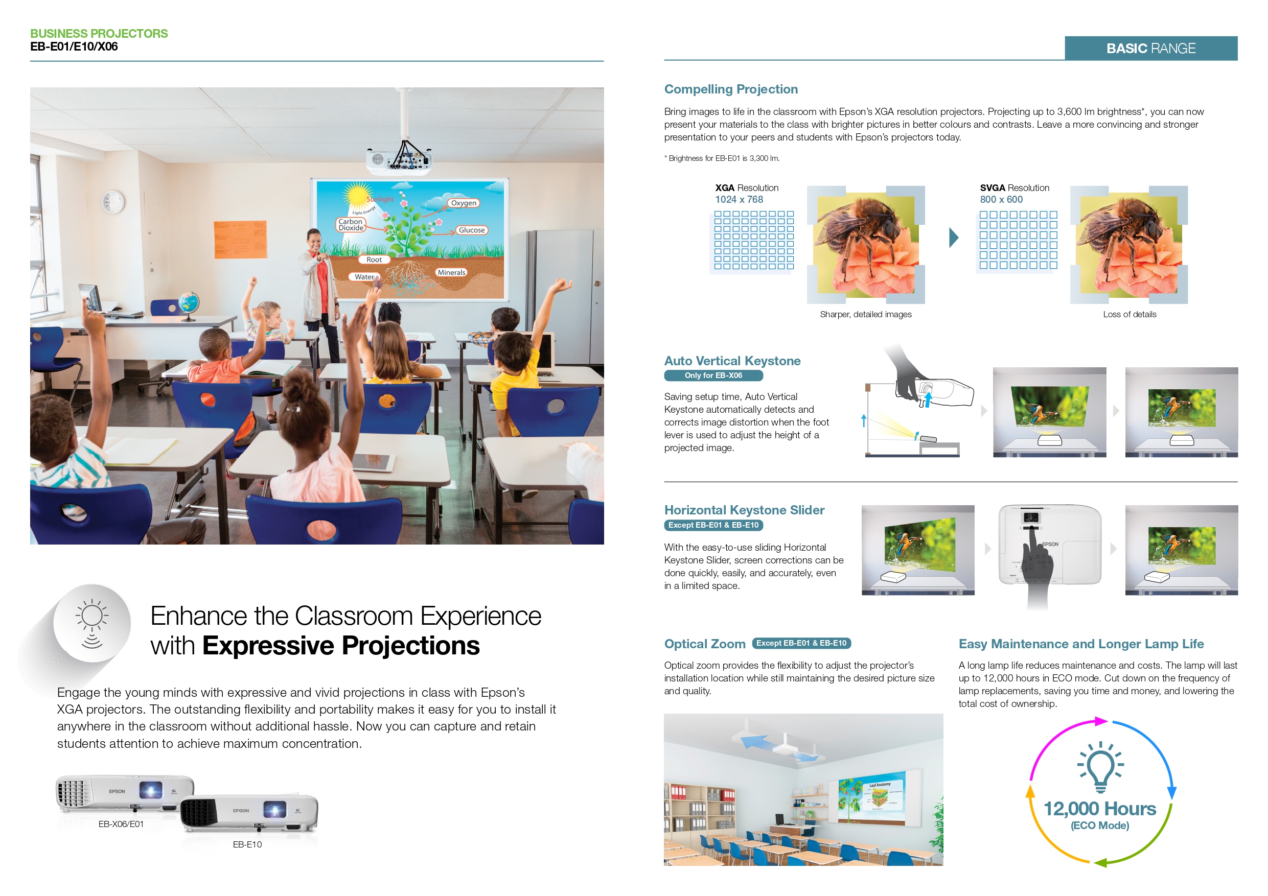 - Lamp life: The lamp in the EB-E10 has an estimated life of up to 12,000 hours in eco mode, which helps to reduce the total cost of ownership.