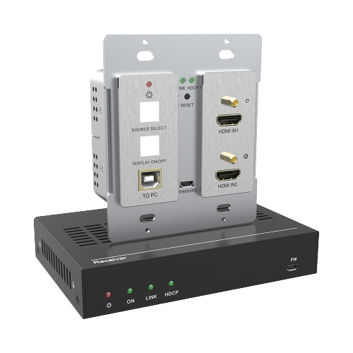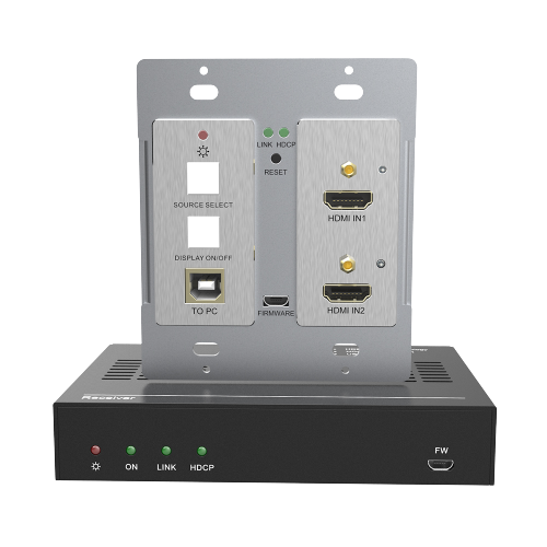 The TPUH406TV-US is a 2x1 wall plate transmitter for HDMI or VGA/audio signal. Extending signal up to 70 meters (230ft) over a single Category cable. Certified HDBaseT technology for a complete professional installation including HD video, power, RS232 control. This device uses Power over HDBaseT (PoH) to provide the flexibility for powering the transmitter from the receiver at the display over the same Category cable. This product is used with HDBaseT 70M extender Receiver.