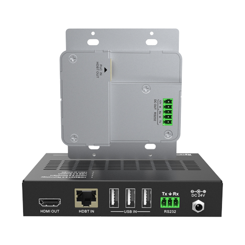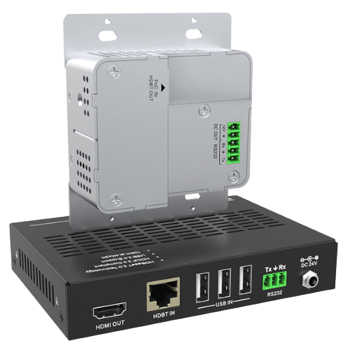 HDBT transmitter and receiver set, supporting transmission of 4K@60Hz, it can distribute HDMI video, USB and RS232 signal at 492ft/150m.